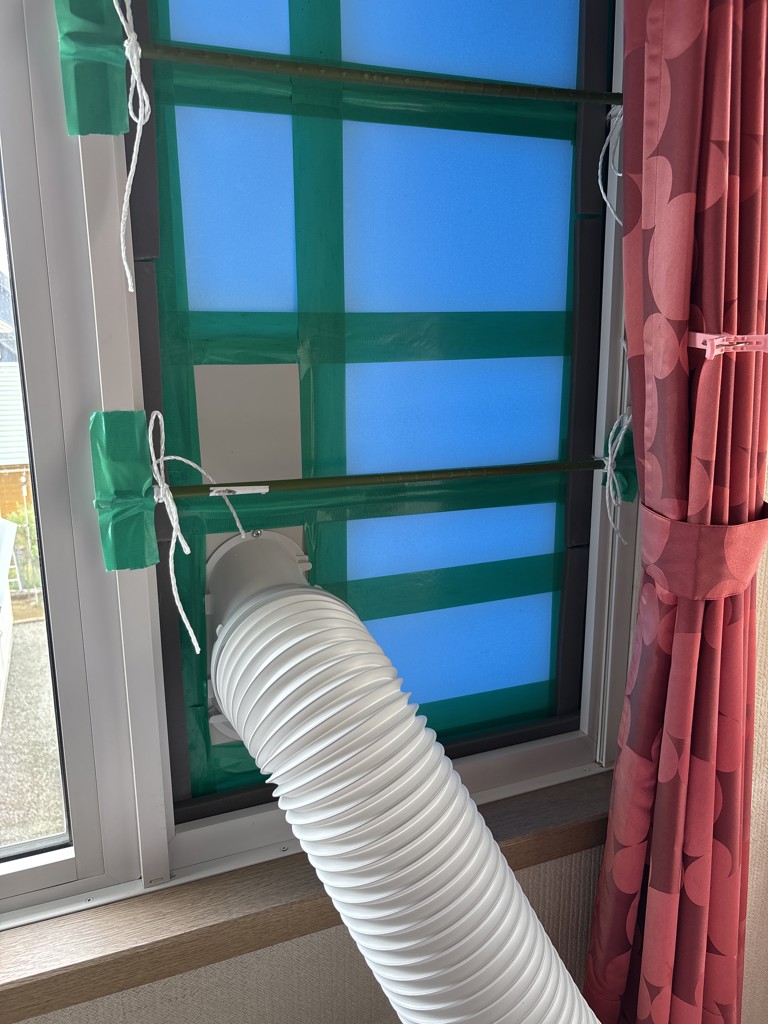 窓に排熱口をつけるのに少し苦労しましたが、1時間程度でつけることができました。