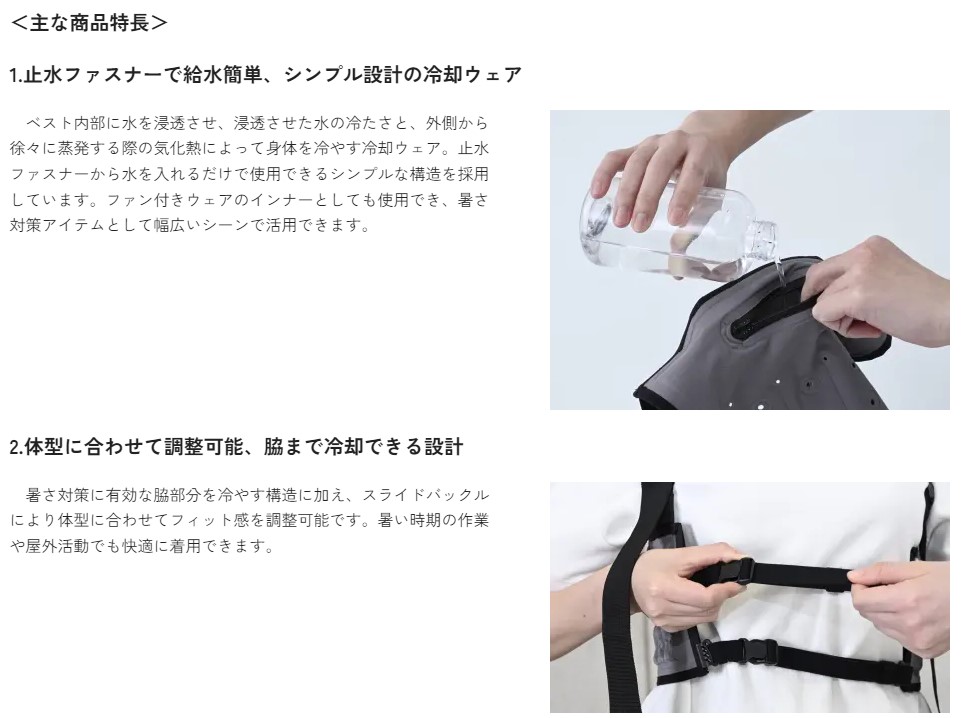 「Mizu fit」はベスト内部に水を浸透させ、浸透させた水の冷たさに加え、外側から徐々に蒸発する際の気化熱によって身体を冷やす冷却ウェアで、水を入れるだけで使用できる手軽さが特長です。